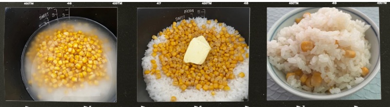 3. 炊き終わったら、バターを入れよく混ぜて出来上がり!(写真中、右)