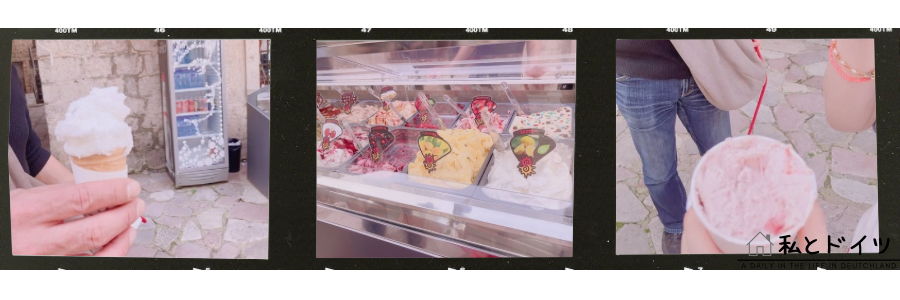 ちょうど甘いものが食べたい時に出会いました!レモン味とストロベリー🎵 旅のお供、食べ歩きジェラートですよね!