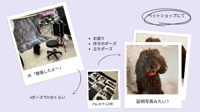 ペットショップで写真のキャンペーンをしていて、撮ってもらいました。5分くらいで3ポーズ撮りました。カット前でボサボサだったけど、思い出の写真が撮れました!写真8枚とCDR,キーホルダーで、€40でした。他にも、チワワの小さい犬や大型犬の3匹の犬が撮っていました!